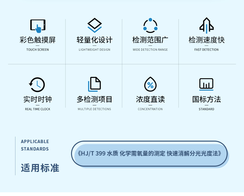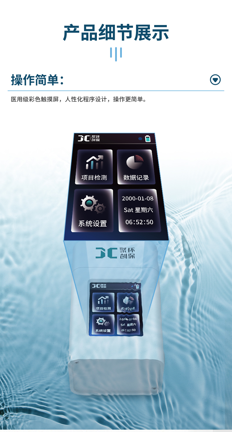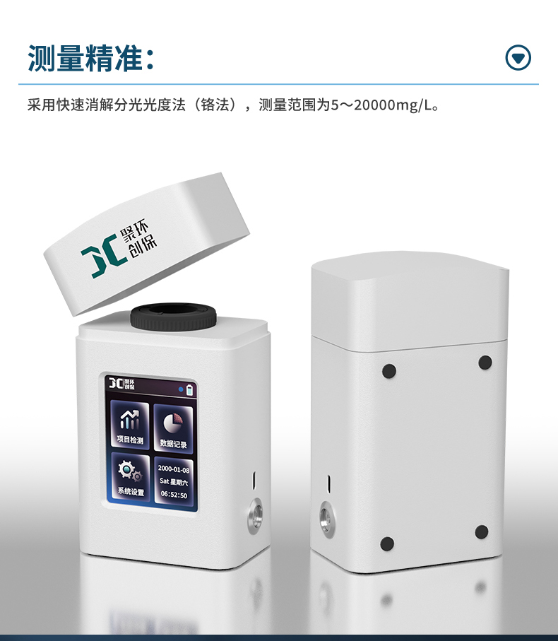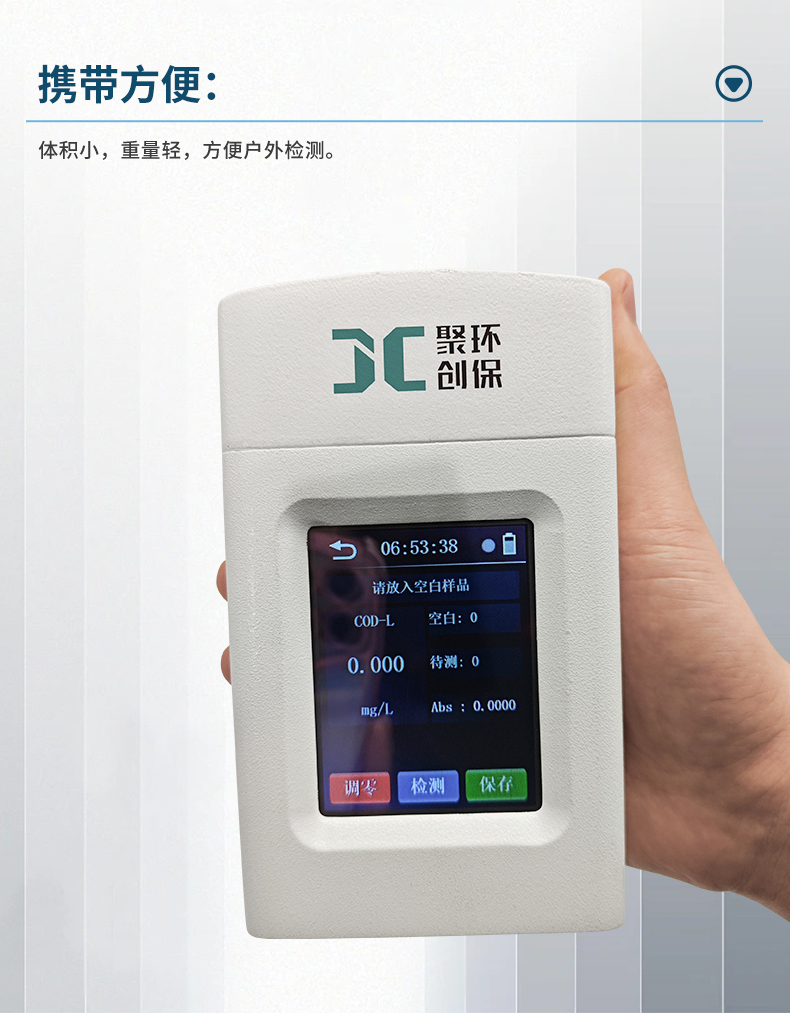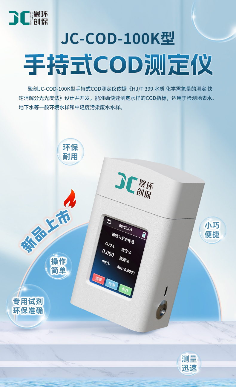 聚创JC-COD-100K型手持式COD测定仪依据《HJ/T 399 水质 化学需氧量的测定 快速消解分光光度法》设计并开发,能准确快速测定水样的COD指标,适用于检测地表水、地下水等一般环境水样和中轻度污染废水水样。