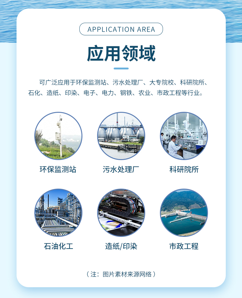 可广泛应用于环保监测站、污水处理厂、大专院校、科研院所、石化、造纸、印染、电子、电力、钢铁、农业、市政工程等行业。
