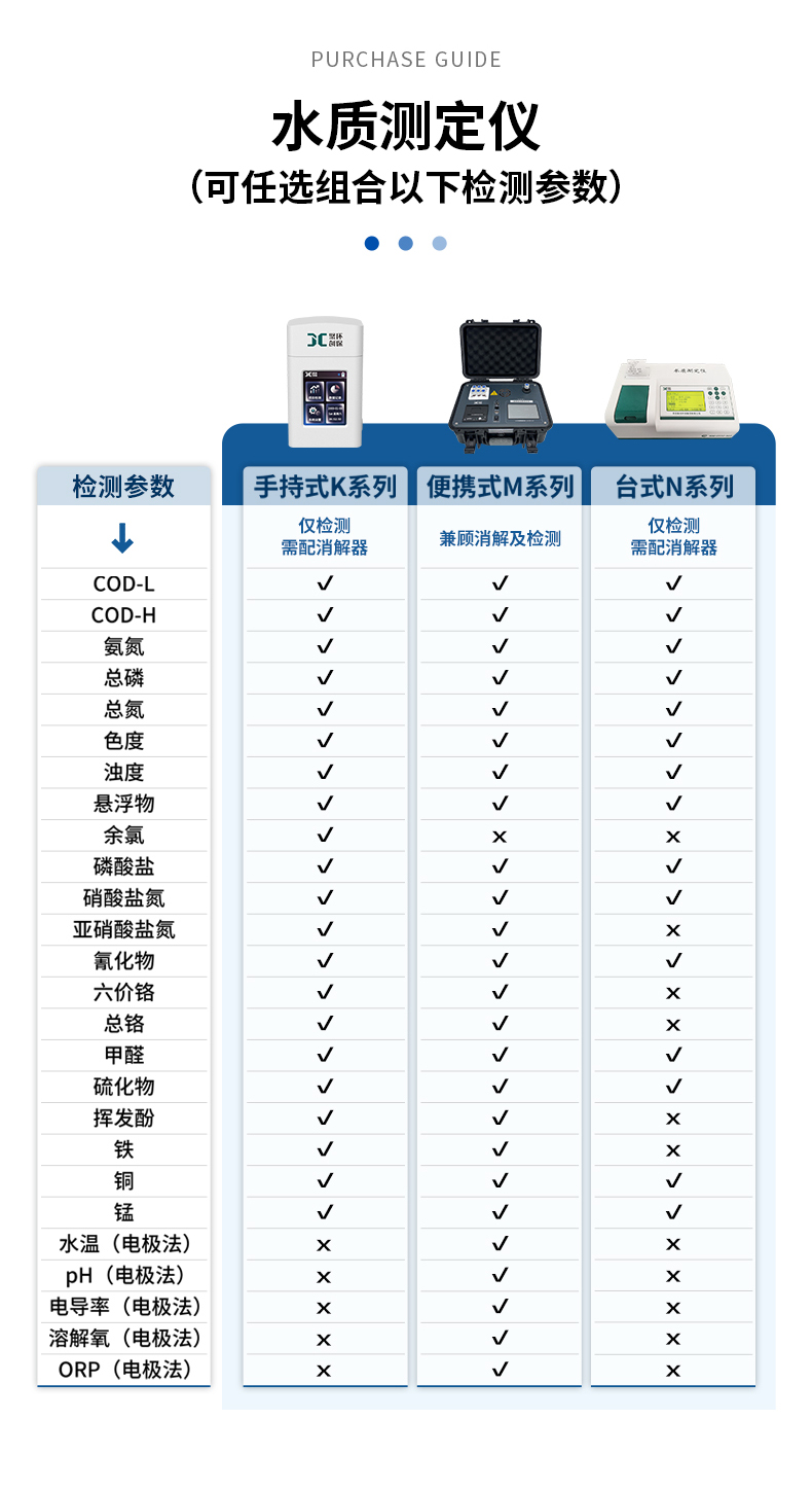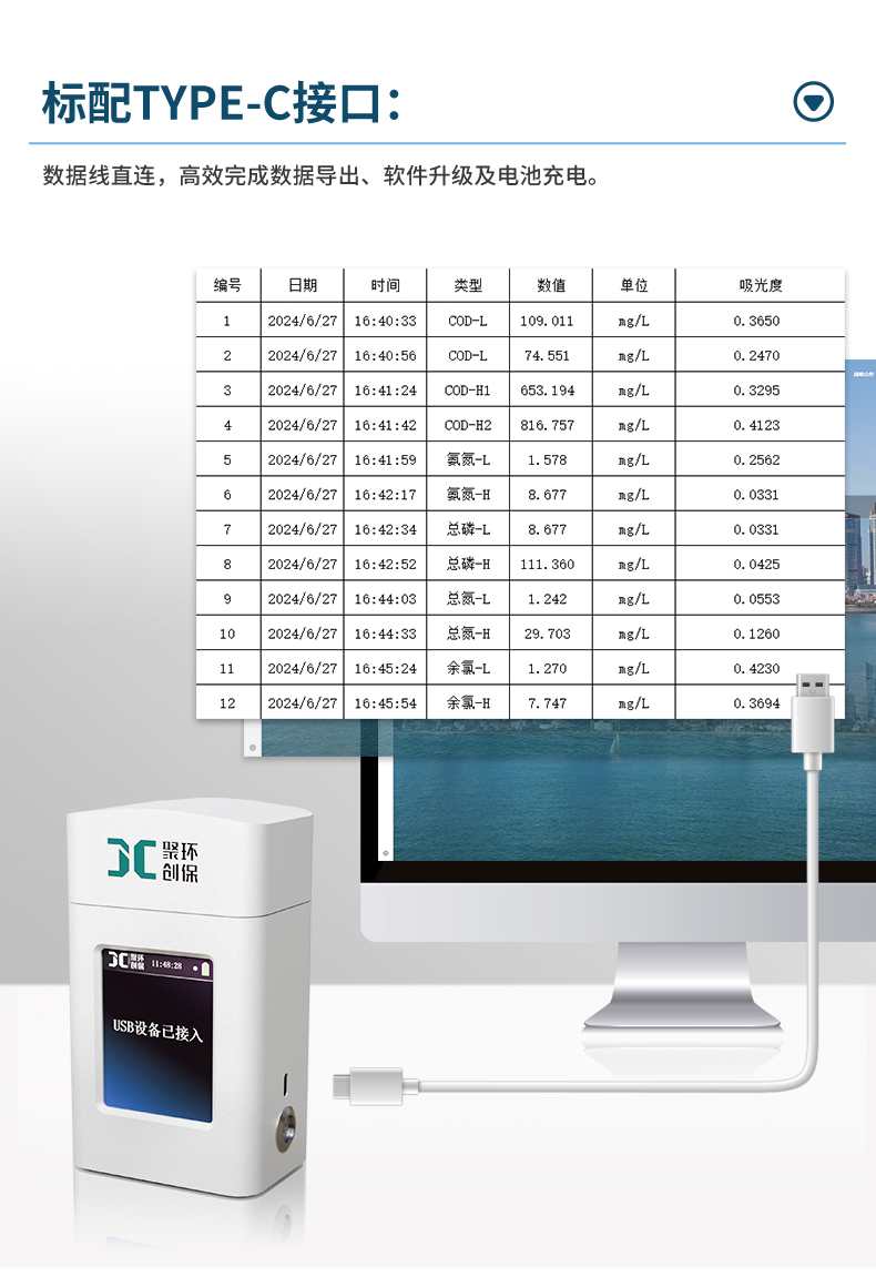 聚创JC-COD-100K型手持式COD测定仪不仅能测定水样的COD指标,而且支持多参数同时测量,如水样的氨氮、总磷、总氮、浊度、色度、悬浮物、硝酸盐氮、磷酸盐、余氯/总氯等其他指标。