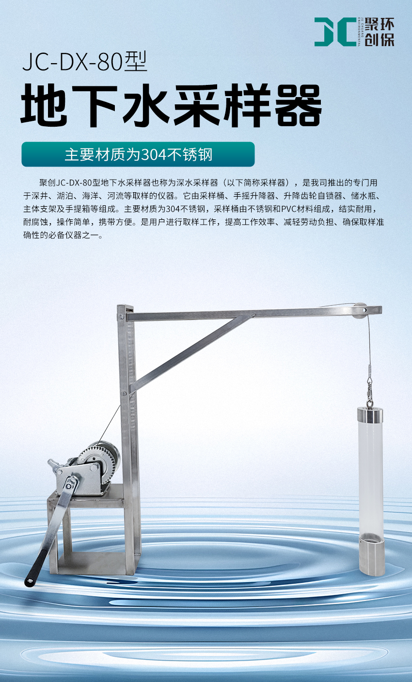 地下水采样器,也称为深水采样器(以下简称采样器),是本公司推出的专门用于深井、湖泊、海洋、河流等取样的仪器。它由采样桶、手摇升降器、升降齿轮自锁器、储水瓶、主体支架及手提箱等组成。主要材质为304不锈钢,采样桶由不锈钢和PVC材料构成,结实耐腐蚀,具有操作简单、携带方便的特点。该采样器是用户进行取样工作,提高工作效率、减轻劳动负担、确保取样准确性的必备仪器之一。