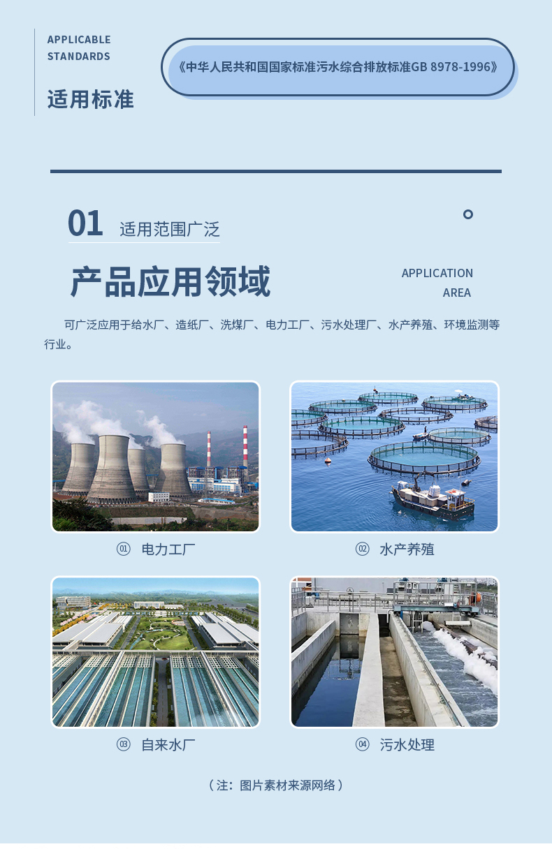 可广泛应用于给水厂、造纸厂、洗煤厂、电力工厂、污水处理厂、水产养殖、环境监测等行业。