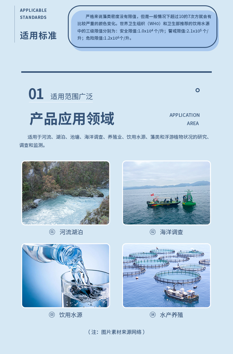 适用于河流、湖泊、池塘、海洋调查、养殖业、饮用水源、藻类和浮游植物状况的研究、调查和监测。
