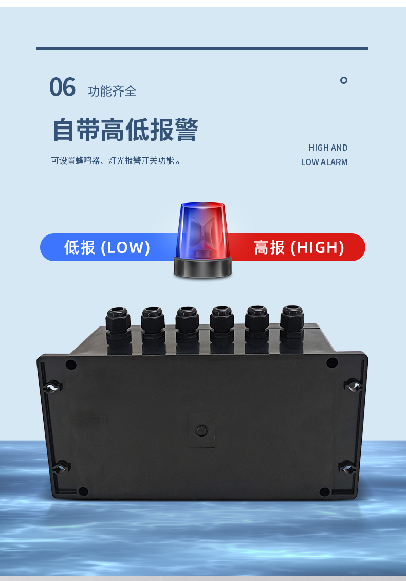 八组ON/OFF继电器接点 分为高点、低点报警输出,继电器滞后量任意设定,继电器最大负载30VDC/5A |