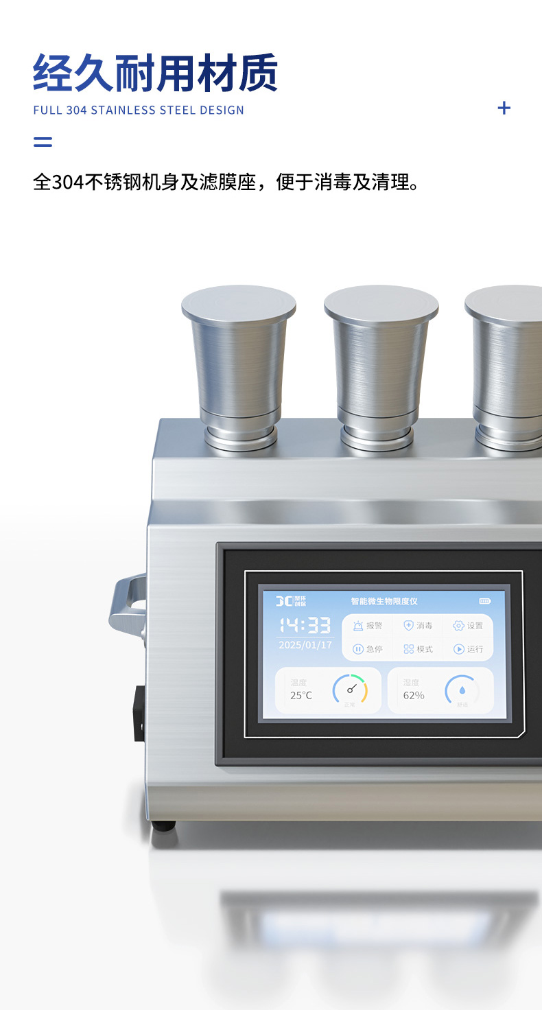 聚创智能三联微生物限度仪JC-WX300C基于薄膜过滤法的原理,与微生物培养器(M50)配套使用,通过液泵的抽滤作用,在系统内部形成负压,供试品在压差作用下被过滤,可能存在的微生物被滤膜截留,通过冲洗滤膜(如有必要),除去抑菌成分,然后反浇培养基进行培养,已检验供试品含菌量。主要用于各类水质、药品、食品等介质中微生物检测及实验室中进行除菌、除微粒等。具有操作过程不易受到污染、易于清洁等特点。