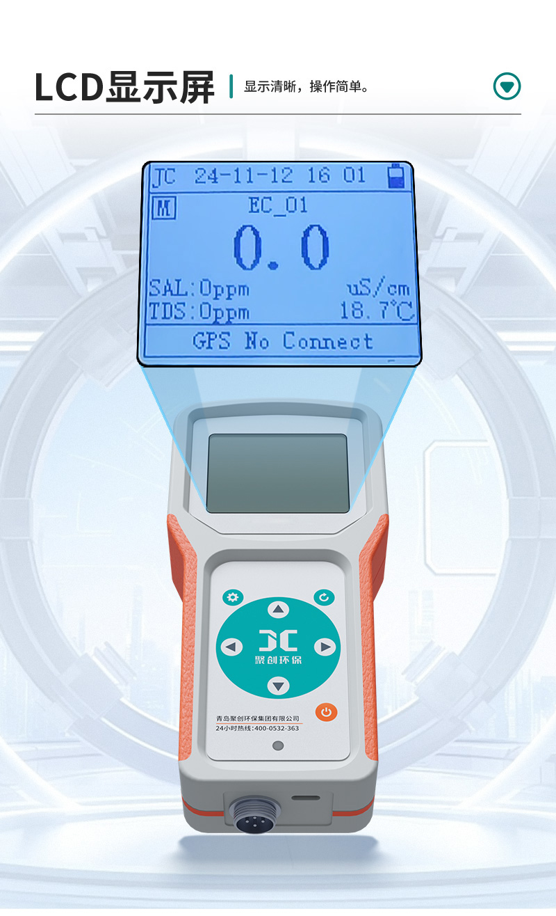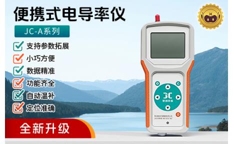 聚创JC-A型便携式电导率仪测试电导的方法,是通过由振荡器产生的交流电压加在电极上(加交流电压的目的是为了避免引起电极的极化),电导池内产生电流,此电流与被测溶液的电导率成正比,经电流-电压变换、放大、检波,变换为直流电压,通过温度补偿等,后经A/D转换器转换成数字信号,通过微电脑显示。整个过程均由微电脑控制和处理。