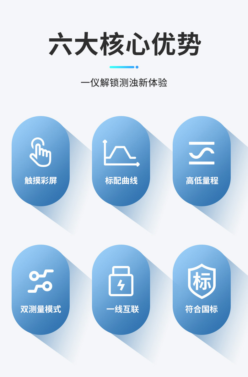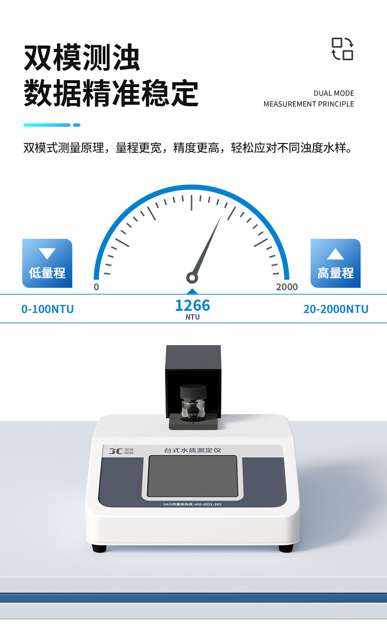 1.测量范围:低量程0-100NTU,高量程20-2000 NTU;