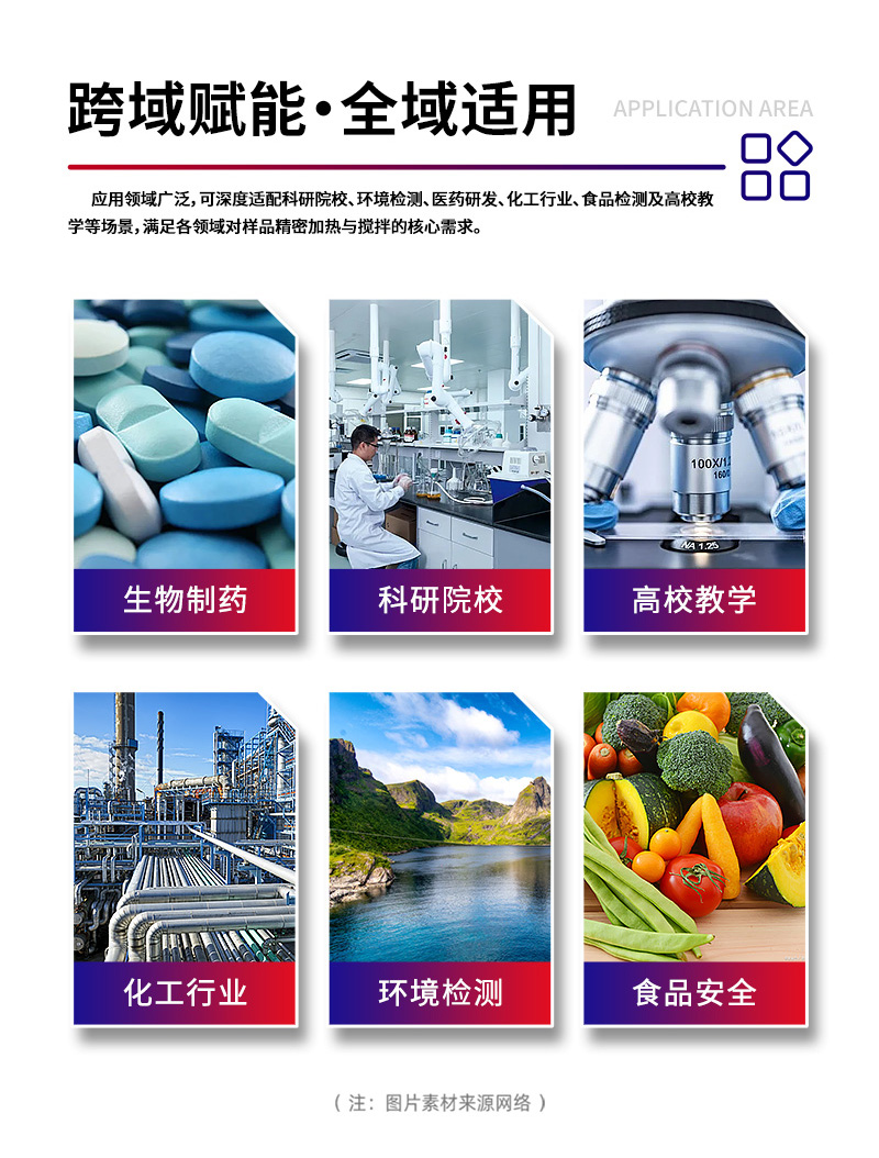 应用领域广泛,可深度适配科研院校、环境检测、医药研发、化工行业、食品检测及高校教学等场景,满足各领域对样品精密加热与搅拌的核心需求。